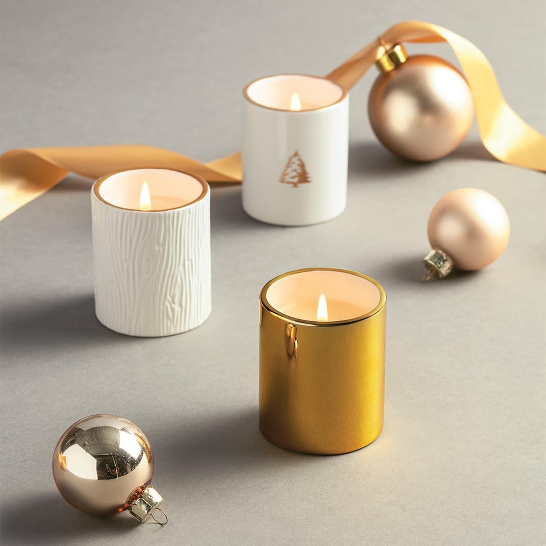 - Thymes Frasier Fir Gilded Poured Candle Trio Set (3 oz each, Pack of 3): Fill your surroundings with Frasier Fir with these three assorted ceramic candles complimenting each other with winter whites, wood grains, and glistening gold.